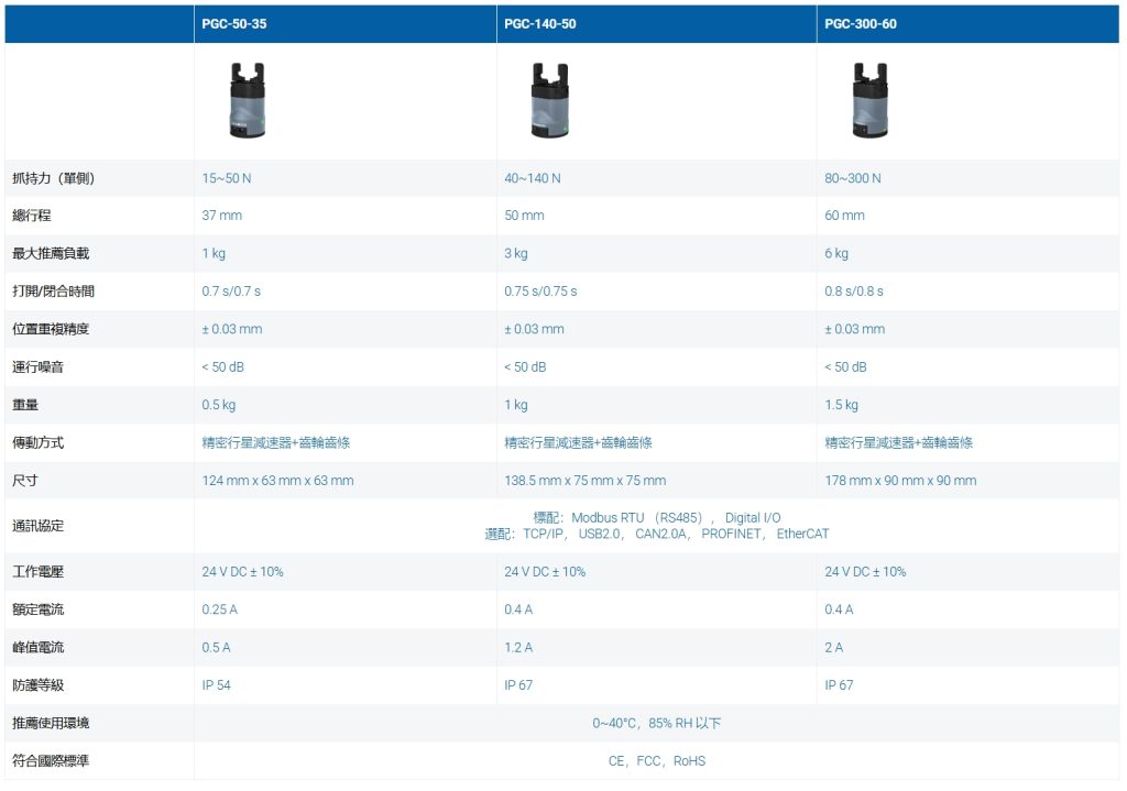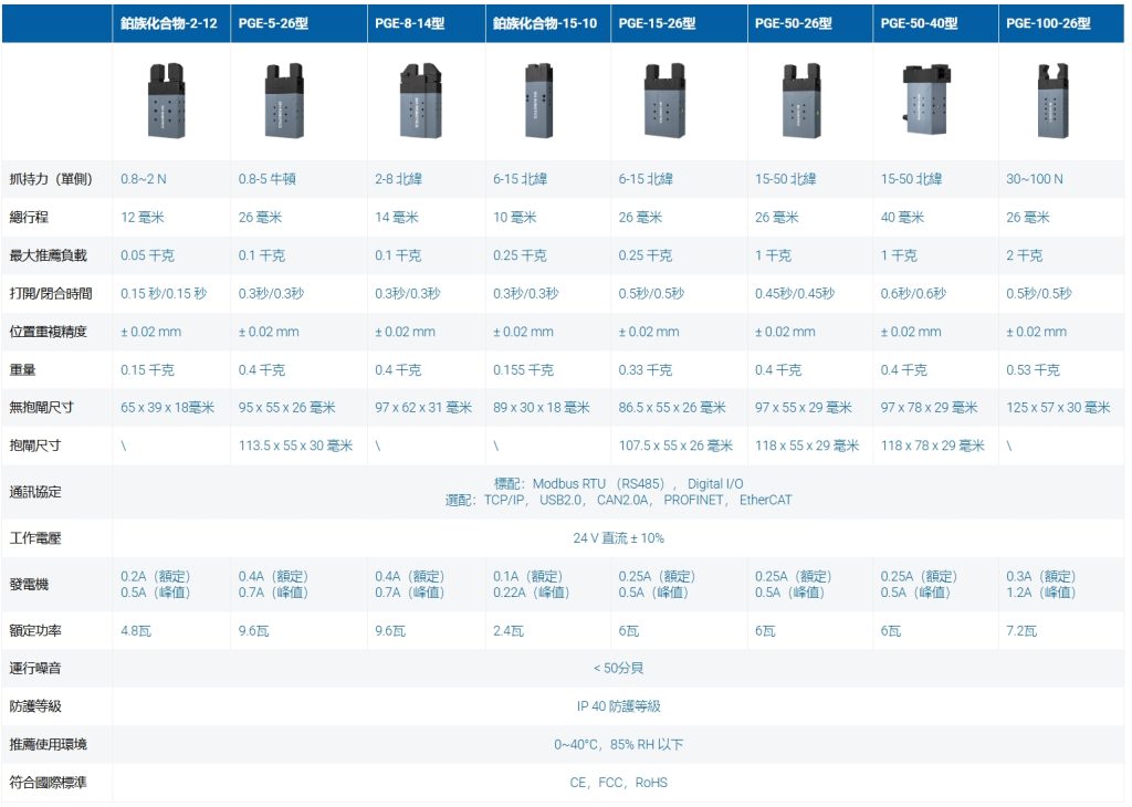 夾爪 產品特點 包絡自我調整抓取 夾爪連杆機构支持包絡自我調整抓取,更適應圓形、球形或异形物體,提高抓取穩定性。 隨插即用 支持與市面上所有主流合作機器人品牌實現隨插即用,夾爪系統內提供大寰圖形化挿件,易於控制與程式設計。 長行程 AG系列電動夾爪總行程最長達到145 mm,一個夾爪可滿足不同尺寸物體的抓取需求,相容性好。 AG系列 AG系列是大寰自主研發的關節型自我調整電爪,適用於合作機器人,以精巧的結構設計適配對不同形狀工件的穩定抓取。 以優异的產品設計,AG系列分別榮獲2019年和2020年紅點設計獎。 該系列電動夾爪既可應用於電晶體晶片、3C電子等精密行業,又可適用於汽車、家電等行業。 驅控一體 參數可調 指尖可換 斷電自鎖 智慧迴響 IP54 CE認證 FCC認證 RoHS認證 PGE系列 PGE 系列是大寰自主研發生產的工業薄型平行電爪,以其精密力控、精巧體積、快速響應,成為工業電動夾爪領域的“爆品”。 PGC系列
